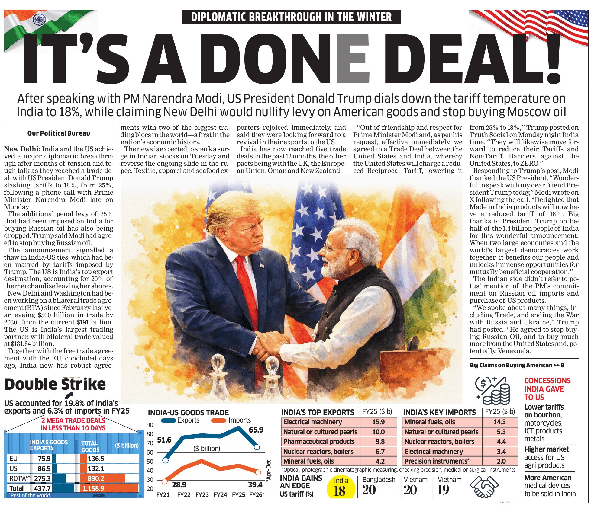এদিকে জ্বালানি নিরাপত্তার দিক থেকেও এই চুক্তি বেশ গুরুত্বপূর্ণ বলেই মনে করছে ওয়াকিবহাল মহল। কারণ, রাশিয়া থেকে তেল আমদানি বন্ধ করাতে এবার ভারত আমেরিকার বাজারে যে ঝুঁকবে তা বলার অপেক্ষা রাখে না। কারণ, মার্কিন এলএনজি, অপরিশোধিত তেল এবং অন্যান্য শক্তিপণ্য আমদানির মাধ্যমে ভারত এবার জ্বালানি উৎসে নয়া রেকর্ডে পৌঁছবে। পাশাপাশি বিমানের যন্ত্রাংশ কেনার ফলে অসামরিক বিমান শিল্পেও যে আধুনিকীকরণ ঘটবে তা বলার অপেক্ষা রাখে না। এখন দেখার, এই চুক্তি ঠিক কতটা কার্যকর হয়।