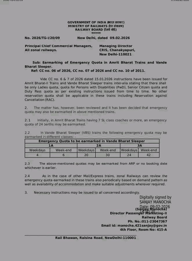 প্রায়শই দেখা যায় যে ট্রেনগুলি যাত্রীতে পরিপূর্ণ থাকে, যার ফলে গুরুতর অসুস্থতা, আকস্মিক পারিবারিক দুর্ঘটনা, অথবা ভিআইপি ডিউটির মতো জরুরি পরিস্থিতিতে টিকিট পাওয়া অসম্ভব হয়ে পড়ে। এতদিন পর্যন্ত, অমৃত ভারত এবং বন্দে ভারত স্লিপার ট্রেনগুলিতে শুধুমাত্র মহিলা, প্রতিবন্ধী, প্রবীণ নাগরিক এবং ডিউটি পাস কোটা পাওয়া যেত। কিন্তু এখন রেলওয়ে বোর্ডের নতুন আদেশ অনুসারে, প্রয়োজনে যাত্রীদের স্বস্তি দেওয়ার জন্য এই ট্রেনগুলিতে এখন “জরুরি কোটার” অধীনে কিছু আসন সংরক্ষণ করা হবে।