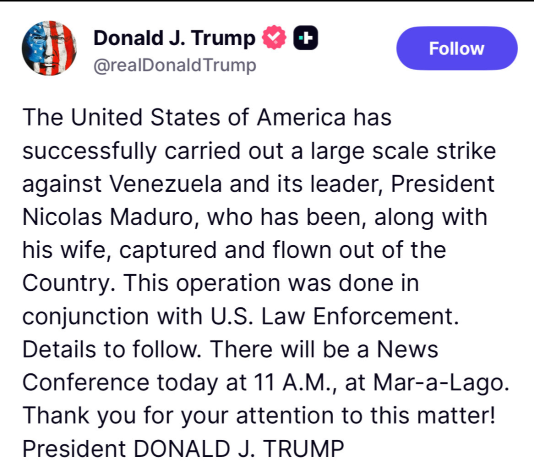শনিবার ভেনেজুয়েলায় হামলার পর এবার মুখ খুললেন আমেরিকার প্রেসিডেন্ট ডোনাল্ড ট্রাম্প। সদ্য নিজের X হ্যান্ডেলে মার্কিন প্রেসিডেন্ট জানিয়েছেন, “ভেনেজুয়েলা এবং তার রাষ্ট্রপতির বিরুদ্ধে আমেরিকা সফলভাবে এয়ার স্ট্রাইক চালিয়েছে।” শুধু তাই নয় এদিন ট্রাম্প এও দাবি করেন, ভেনেজুয়েলার প্রেসিডেন্ট মাদুরো এবং তাঁর স্ত্রীকে আটক করা হয়েছে….