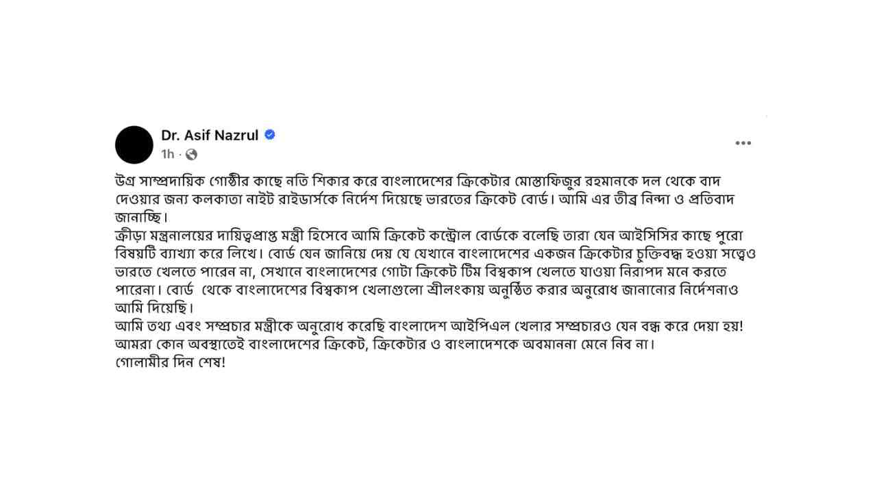 বিক্রম ব্যানার্জী, কলকাতা: মুস্তাফিজুর রহমানকে IPL থেকে বিদায় দেওয়ার পরই মুখোশ ছেড়ে বেরিয়ে এসেছে বাংলাদেশ। ওপার বাংলা থেকে হুমকি আসছে, ভারতে বিশ্বকাপ খেলতে যাবে না টাইগাররা। এ নিয়ে, একপ্রকার হুমকি দিয়েই বাংলাদেশের ক্রীড়া উপদেষ্টা আসিফ নজরুল জানিয়েছেন, টি-টোয়েন্টি বিশ্বকাপে (2026 Men’s T20 World Cup) নিজেদের ম্যাচগুলি শ্রীলঙ্কায় খেলতে চায় বাংলাদেশ ক্রিকেট দল। সেটা হলে আগামী দিনেও যে বাংলাদেশের সাথে পাকিস্তানের মতোই সম্পর্কের হাল হবে ভারতের সেটা বলার অপেক্ষা রাখে না। যদিও এ নিয়ে খুব একটা চিন্তিত নয় BCCI।