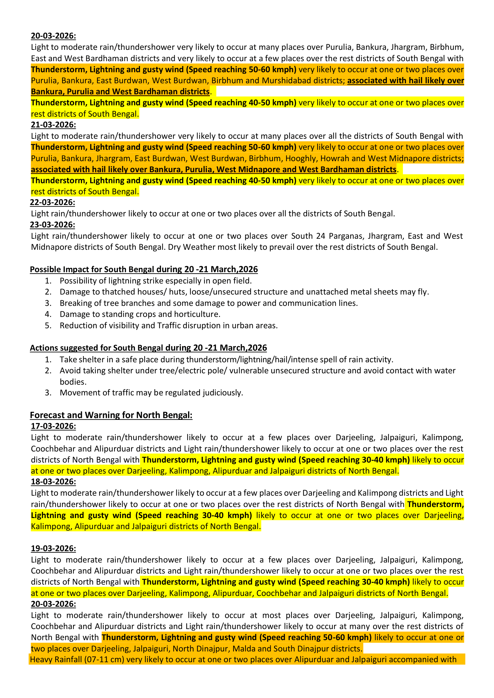 আইএমডি কলকাতা জানিয়েছে, বায়ুমণ্ডলের নিম্ন স্তরে অনুকূল বায়ুপ্রবাহ এবং বঙ্গোপসাগর থেকে প্রবল আর্দ্রতার প্রবেশের কারণে ২২শে মার্চ পর্যন্ত রাজ্যের বিভিন্ন জেলায় বজ্রবিদ্যুৎ সহ তুমুল ঝড় বৃষ্টি হওয়ার জোরালো সম্ভাবনা রয়েছে।