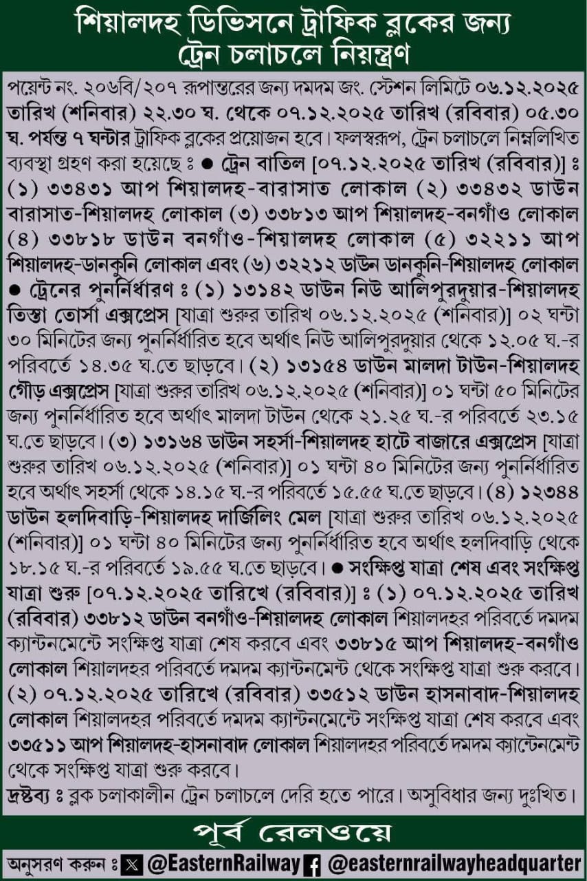 সহেলি মিত্র, কলকাতাঃ হাওড়া ডিভিশনের পর এবার শিয়ালদা ডিভিশনের (Sealdah railway division) যাত্রীদের জন্য রইল জরুরি খবর। কাজের জন্য নতুন করে শিয়ালদা ডিভিশনে আবারও বাতিল থাকতে চলেছে একগুচ্ছ ট্রেন। হ্যাঁ একদম ঠিক শুনেছেন। জানা গিয়েছে, পয়েন্ট নং ২০৬ বি/২০৭ রুপান্তরের জন্য দমদম জংশন স্টেশন লিমিটে আগামী ৬ ডিসেম্বর শনিবার রাত ২২:৩০ থেকে ৭ ডিসেম্বর রবিবার সকাল ৫:৩০ অর্থাৎ ৭ ঘণ্টার জন্য ট্রাফিক ব্লকের প্রয়োজন হবে। এর ফলে একাধিক ট্রেন বাতিল থাকবে, সঙ্গে বেশ কিছু ট্রেন চলাচলের ক্ষেত্রে নিয়ন্ত্রণ করা হবে। চলুন বিশদে জেনে নেওয়া যাক।