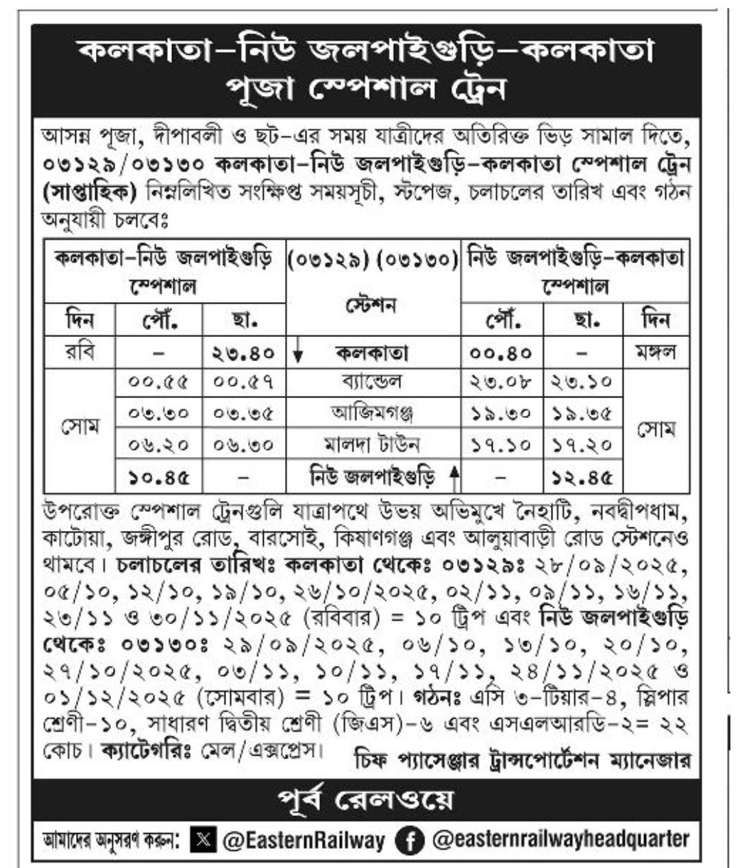রেলের তরফে জানানো হয়েছে, আসন্ন দুর্গাপুজো, দীপাবলি এবং ছট পুজোর সময়ে ট্রেনগুলিতে অতিরিক্ত ভিড় সামাল দিতে নিউ জলপাইগুড়ির উদ্দেশ্যে স্পেশাল ট্রেন দেওয়া হল। না তবে এই ট্রেনটি কিন্তু হাওড়া বা শিয়ালদা থেকে ছাড়বে না। ট্রেন নম্বর ০৩১২৯/০৩১৩০ কলকাতা-নিউ জলপাইগুড়ি-কলকাতা স্পেশাল ট্রেন চালানো হবে। এটি সাপ্তাহিক ট্রেন হবে। অর্থাৎ এই ট্রেনটি কলকাতা স্টেশন থেকে ছাড়বে।