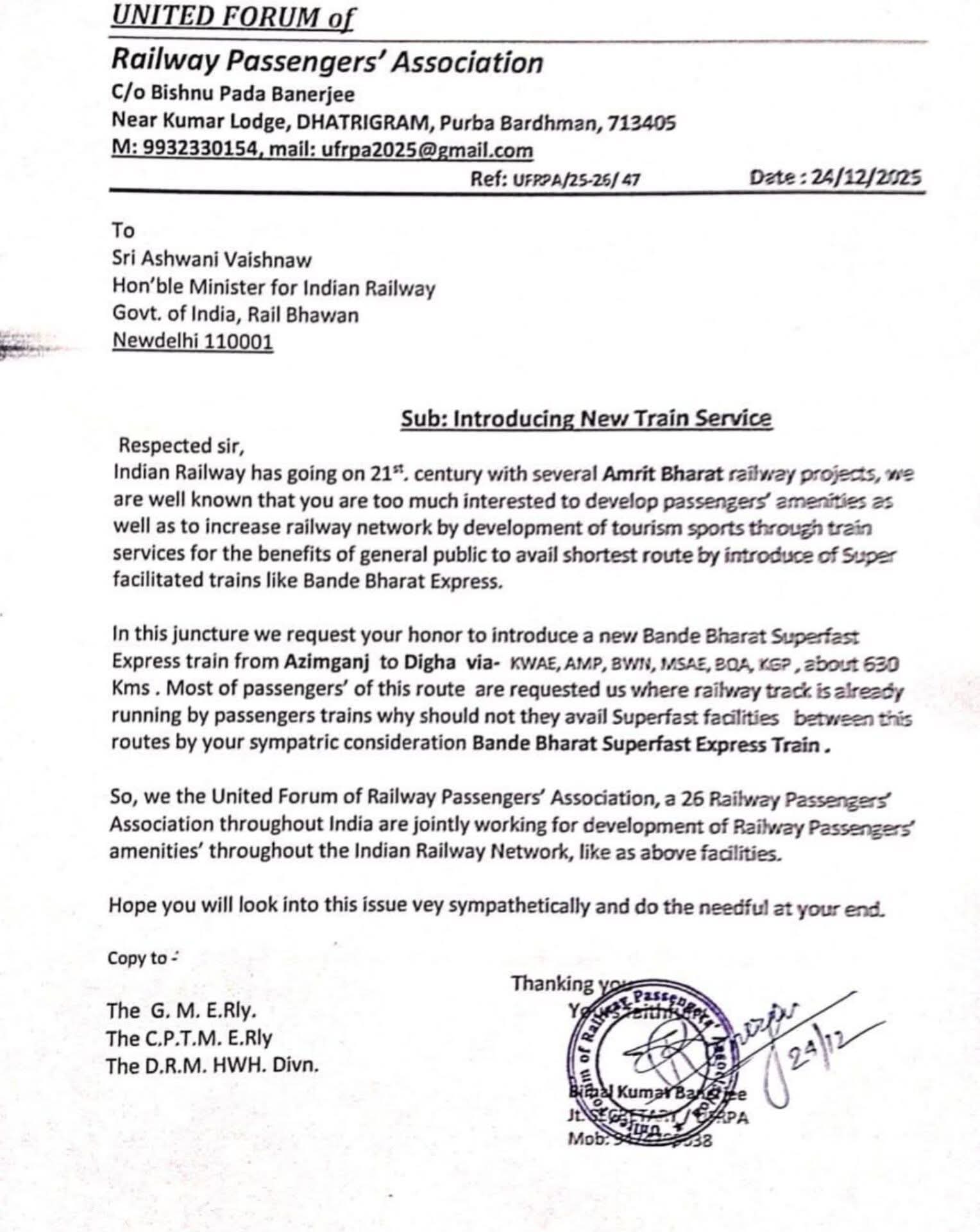 চিঠিতে আরও লেখা আছে, ‘এই রুটের বেশিরভাগ যাত্রী আমাদের কাছে অনুরোধ করেছেন, যেখানে যাত্রী ট্রেন ইতিমধ্যেই চলাচল করছে, সেখানে কেন তারা সুপার ফাস্ট সুবিধা পেতে পারবে না। আপনার সহানুভূতিপূর্ণ বিবেচনার মাধ্যমে বন্দে ভারত সুপারফাস্ট এক্সপ্রেসের মাধ্যমে। তাই আমরা ভারতীয় রেলওয়ে নেটওয়ার্কের জুড়ে যাত্রী সুবিধা উন্নয়নের জন্য ভারতের বিভিন্ন প্রান্তের ২৬টি রেলওয়ে যাত্রী সমিতির একটি সমন্বিত ফোরাম হিসাবে একত্রিত হয়ে আপনার কাছে এই রুটে ট্রেন চালানোর দাবি জানাচ্ছি।’