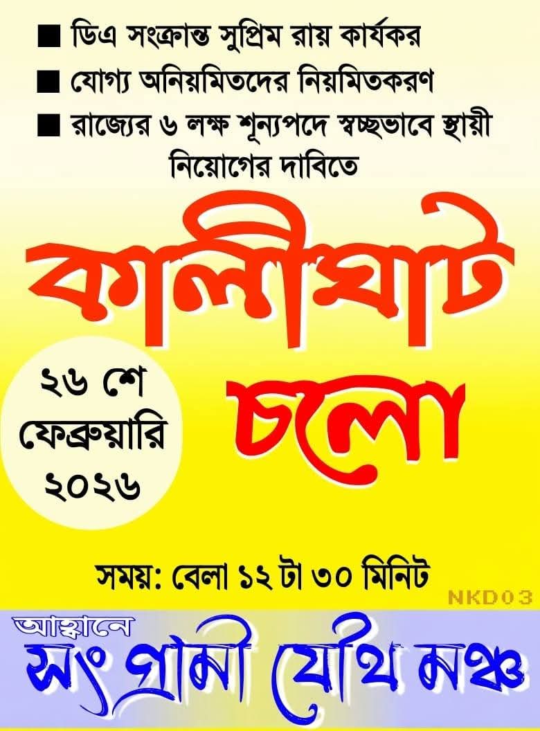 সংগ্রামী যৌথ মঞ্চের নেতা ভাস্কর ঘোষ (Bhaskar Ghosh) বলেছেন, ‘অপেক্ষা করছি কবে সরকার দয়া করবে! এই ভাবে আর কতো দিন? আর কবে?’ এরই মাঝে আগামী ২৬ ফেব্রুয়ারি, ২০২৬-এ কালীঘাট চলোর ডাক দেওয়া হয়েছে সরকারি কর্মীদের তরফে। আহ্বান জানিয়েছে সংগ্রামী যৌথ মঞ্চ। পোস্ট অনুযায়ী, ডিএ সংক্রান্ত সুপ্রিম রায় কার্যকর, যোগ্য অনিয়মিতদের নিয়মিতকরণ এবং রাজ্যের ৬ লক্ষ শূন্যপদে স্বচ্ছ ভাবে স্থায়ী নিয়োগের দাবিতে আগামী ২৬ ফেব্রুয়ারি কালীঘাট চলোর ডাক দেওয়া হয়েছে। সময় বেলা ১২:৩০ মিনিটে।