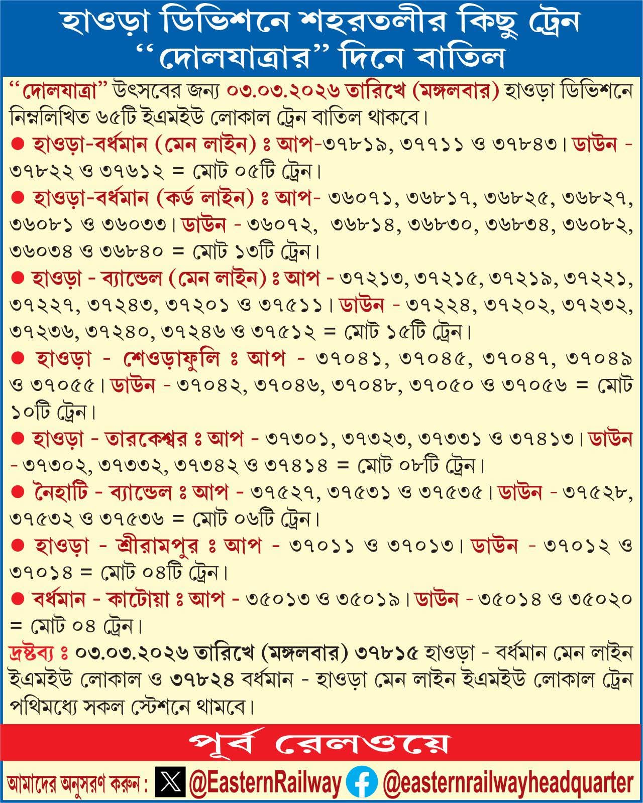 এদিকে হাওড়া-ব্যান্ডেল মেন লাইনে আপ ৩৭২১৩, ৩৭২১৫, ৩৭২১৯, ৩৭২২১, ৩৭২২৭, ৩৭২৪৩, ৩৭২০১ ও ৩৭৫১১, এছাড়া ডাউনে ৩৭২২৪, ৩৭২০২। ৩৭২৩২, ৩৭২৩৬, ৩৭২৪০, ৩৭২৪৬ ও ৩৭৫১২ মিলিয়ে মোট ১৫টি ট্রেন বাতিল থাকবে।