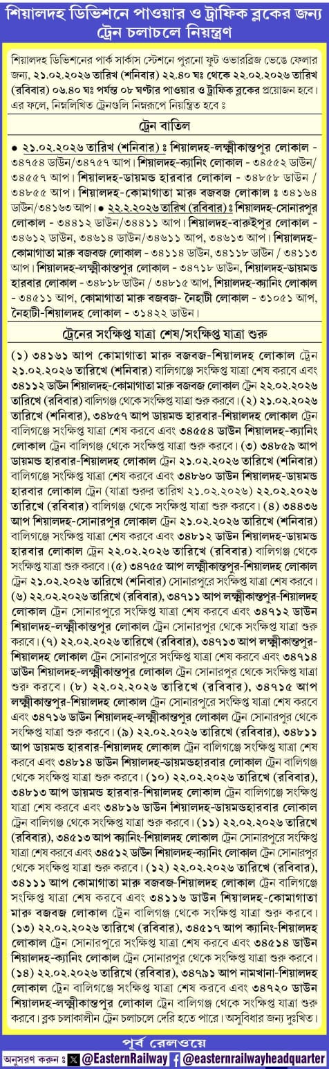 পূর্ব রেলের তরফে জারি করা বিজ্ঞপ্তি অনুযায়ী, শিয়ালদহ ডিভিশনের পার্ক সার্কাস স্টেশনে (Park Circus Station) পুরনো ফুট ওভারব্রিজ ভাঙার কাজ হবে। আগামী ২১.০২.২০২৬ (শনিবার) রাত ২২:৪০ থেকে ২২.০২.২০২৬ (রবিবার) সকাল ০৬:৪০ পর্যন্ত। মোট ৮ ঘণ্টা পাওয়ার ও ট্রাফিক ব্লক থাকবে। এহেন পরিস্থিতিতে কিছু ট্রেন নিয়ন্ত্রিত/বাতিল/সংক্ষিপ্ত যাত্রা করবে চলুন জেনে নেওয়া যাক।