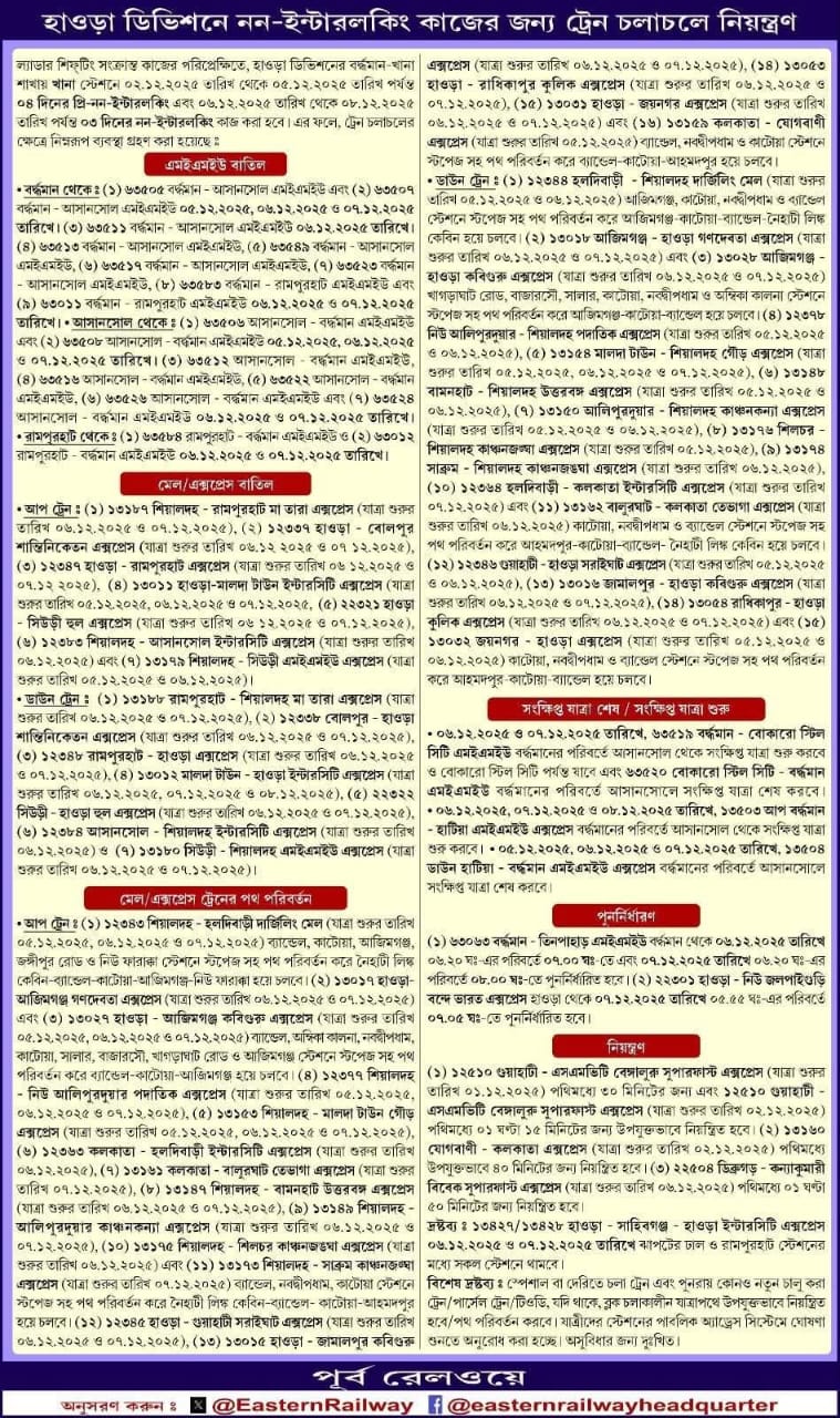 পূর্ব রেলের তরফে জারি করা বিজ্ঞপ্তি অনুযায়ী, ল্যাডার শিফটিং সংক্রান্ত কাজের পরিপ্রেক্ষিতে হাওড়া ডিভিশনের বর্ধমান-খানা শাখায় খানা স্টেশনে আগামী ২ ডিসেম্বর ২০২৫ থেকে ৫ ডিসেম্বর, ২০২৫ অবধি অর্থাৎ টানা চারদিন প্রি নন ইন্টারলকিং এবং আগামী ৬ থেকে ৮ ডিসেম্বর, ২০২৫ অবধি তিনদিনের নন ইন্টারলকিং কাজ করা হবে। এর ফলে বহু মেমু ট্রেন থেকে শুরু করে মেল, এক্সপ্রেস ট্রেন চলাচলের ক্ষেত্রে ব্যবস্থা গ্রহণ করেছে পূর্ব রেল।