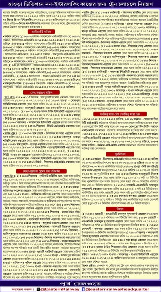 বিজ্ঞপ্তি অনুযায়ী, ১৩১৮৭ শিয়ালদা-রামপুরহাট মা তারা এক্সপ্রেস, ১২৩৩৭ হাওড়া-বোলপুর শান্তিনিকেতন এক্সপ্রেস, ১২৩৪৭ হাওড়া-রামপুরহাট এক্সপ্রেস, ১৩০১১ হাওড়া-মালদা টাউন ইন্টারসিটি এক্সপ্রেস, ২২৩২১ হাওড়া-সিউড়ি হুল এক্সপ্রেস, ১২৩৮৩ শিয়ালদা-আসানসোল ইন্টারসিটি এক্সপ্রেস, ১৩১৭৯ শিয়ালদা-সিউড়ি মেমু এক্সপ্রেস বাতিল থাকবে। উল্লেখিত ট্রেনগুলি আপ এবং ডাউন উভয়েই বাতিল থাকবে।