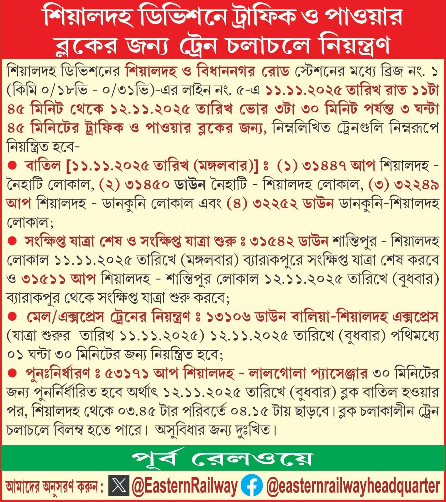 অপরদিকে শিয়ালদা ডিভিশনের শিয়ালদা অভিধান নগর স্টেশনের মধ্যে ব্রিজ নং (কিমি ০/১৮ভি-০/৩১ভি)-এর লাইন নং ৫-এ ১১ নভেম্বর রাত ১১:৪৫ মিনিট থেকে ১২ নভেম্বর ভোর তিনটে ৩০ মিনিট অবধি টানা তিন ঘন্টা রাত ১১:৪৫ মিনিট থেকে ১২ নভেম্বর ভোর ৩:৩০ মিনিট অবধি টানা ৩ ঘন্টা ৪৫ মিনিটের ট্র্যাফিক ব্লকের প্রয়োজন হবে। যার দরুন ৩১ চাচার সাত আপ শিয়ালদা নৈহাটি লোকাল ট্রেন নম্বর ৩১৪৫০ ডাউন নৈহাটি শিয়ালদা লোকাল, ৩২৪৯৮ শিয়ালদা ডানকুনি লোকাল এবং ৩২৫২ ডাউন ডানকুনি শিয়ালদা লোকাল বাতিল থাকবে।