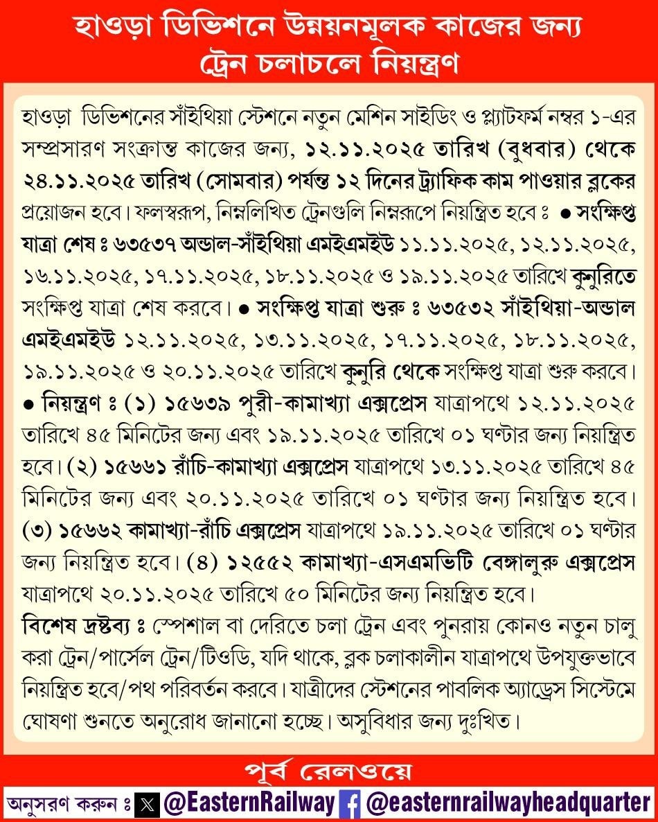 প্রথমে আসা যাক হাওড়া ডিভিশনের ক্ষেত্রে। পূর্ব রেলের জারি করা বিজ্ঞপ্তি অনুযায়ী, হাওড়া ডিভিশনের সাঁইথিয়া স্টেশনের নতুন মেশিন সাইডিং ও প্লাটফর্ম নম্বর ১-এর সম্প্রসারণ সংক্রান্ত কাজের জন্য ১২ নভেম্বর বুধবার থেকে ২৪ নভেম্বর সোমবার পর্যন্ত টানা ১২ দিনের ট্রাফিক কাম পাওয়ার ব্লকের প্রয়োজন হবে।  যে কারণে নিয়ন্ত্রিত হবে বহু ট্রেন। এই যেমন ট্রেন নম্বর ৬৩৫৩৭ অন্ডাল সাঁইথিয়া মেমু ট্রেন ১১,১২,১৬,১৭,১৮ এবং ১৯ নভেম্বর কুনুরিতে সংক্ষিপ্ত যাত্রা শেষ করবে।