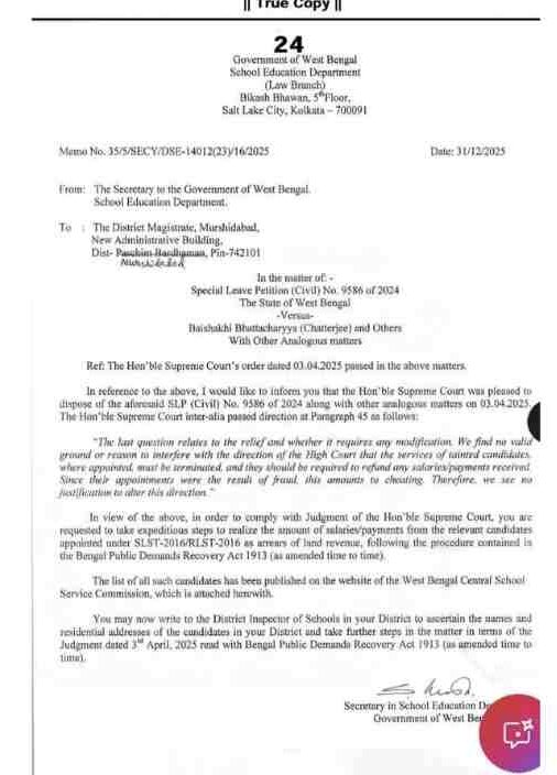 রিপোর্ট মোতাবেক, গতকাল অর্থাৎ মঙ্গলবার, সুপ্রিম কোর্টে রাজ্যের শিক্ষা দফতর এবং স্কুল সার্ভিস কমিশনের তরফে হলফনামা জারি করা হয়েছিল। সেখানে স্পষ্ট জানানো হয় যে, ‘দাগি বা চিহ্নিত অযোগ্য’ শিক্ষকদের কাছ থেকে সুদসমেত বেতন ফেরত নেওয়া হবে। সেক্ষেত্রে টাকা আদায় হবে ‘বেঙ্গল পাবলিক ডিমান্ডস রিকভারি অ্যাক্ট, ১৯১৩’ অনুযায়ী। অর্থাৎ এই আইনের মাধ্যমে যেভাবে সরকারি বকেয়া যেমন ভাবে ভূমি রাজস্ব, সরকারি কর, জরিমানা আদায় করা হয়, সেই ভাবে তাঁদের বেতনগুলি আদায় করা হবে। ইতিমধ্যেই জেলাশাসকদের টাকা আদায়ের নির্দেশও দেওয়া হয়েছে।
