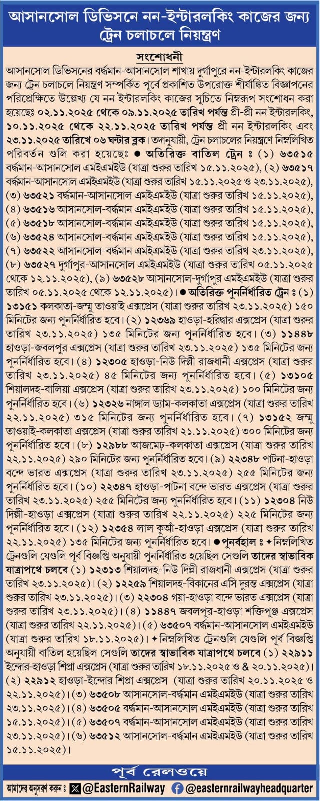 আসানসোল ডিভিশনের বর্ধমান-আসানসোল শাখায় দুর্গাপুরের নন ইন্টারলকিং কাজের জন্য বহু ট্রেন চলাচল নিয়ন্ত্রণ সম্পর্কিত একটি তালিকা প্রকাশ করলে পূর্ব রেল। একটানা কাজের জন্য বহু ট্রেন বাকি থেকে শুরু করে বেশ কিছু ট্রেন পুননির্ধারিত করা হয়েছে। গত ২ নভেম্বর থেকে শুরু হয়েছে আগামী ২২ নভেম্বর অবধি প্রি নন ইন্টারলকিং এবং ২৩ নভেম্বর ৬ ঘন্টার ব্লক থাকবে। যে কারণে বহু ট্রেন বাতিলের ঘোষণা করেছে পূর্ব রেল।
