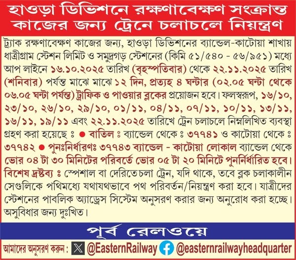ইতিমধ্যে পূর্ব রেলের তরফে একটি বিজ্ঞপ্তি জারি করা হয়েছে। আর এই বিজ্ঞপ্তি দেখে চোখ কপালে উঠেছে সকলের। রেলের বিজ্ঞপ্তি অনুসারে, ট্র্যাক রক্ষণাবেক্ষণ কাজের জন্য হাওড়া ডিভিশনের ব্যান্ডেল- কাটোয়ার শাখায় (Bandel-Katwa line) ধাত্রীগ্রাম স্টেশন লিমিট ও সমুদ্রগড় স্টেশনের মধ্যে আপ লাইনে প্রত্যেকদিন ৪ ঘন্টার ট্রাফিক ও পাওয়ার ব্লকে প্রয়োজন হবে। সেজন্য আগামী ১৬ই অক্টোবর বৃহস্পতিবার থেকে আগামী ২২ অক্টোবর শনিবার পর্যন্ত মাঝে মাঝে অর্থাৎ টানা ১২ দিন প্রত্যেক চার ঘণ্টার জন্য ট্রাফিক ব্লকের প্রয়োজন থাকবে।